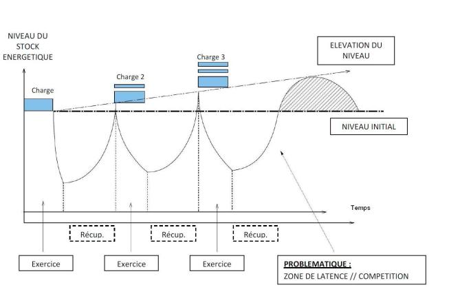 Cette surcompensation est valable sur une succession de séances d’entraînement. Il s’agit de l’effet cumulé, estimé en fonction du nombre de séances (3 minimum) et de l’intensité. La difficulté de la gestion de cet ensemble d’alternance » stimulation – récupération » désigné sous le terme de « charge d’entraînement », est de ne pas créer une fatigue générale persistante négative (surentraînement) ou une stagnation voire une diminution des capacités (sous entraînement).