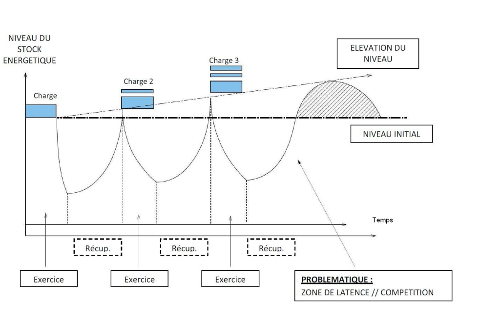 Cette surcompensation est valable sur une succession de séances d’entraînement. Il s’agit de l’effet cumulé, estimé en fonction du nombre de séances (3 minimum) et de l’intensité. La difficulté de la gestion de cet ensemble d’alternances » stimulation – récupération » désigné sous le terme de charges d’entraînement, est de ne pas créer une fatigue générale persistante négative (surentraînement) ou une stagnation voire une diminution des capacités (sous-entraînement).